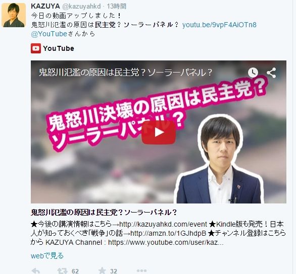 こちらの服部さん@hattorisarnという人など、興味深いことに、今私が紹介した「日刊スポーツ」の記事をツイートしながら、「民主党、菅直人たちな」「太陽光利権」と書いています。え…、貴方が引用しているまさにその記事に、「昨年(2014年)3月に堤防が削り取られた」って書いてあるんだけど…。貴方、自分で記事読まないでツイートしてるわけ? 上で紹介した25mom-snsn@tomarigi25も、八神明@MTA_CROWLEYも、全く同様に、「日刊スポーツ」の記事を引用しながら「民主党のせいだ」って言ってますね。あんたら自分がツイートしている記事の冒頭部分ぐらい読んだら?