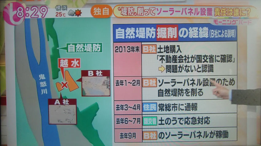 9月14日のテレビ朝日系『モーニングバード』でそのソーラーパネルについて言及していましたが、 それによると、ソーラーパネル設置及び自然堤防を削った時系列はこうなっております。