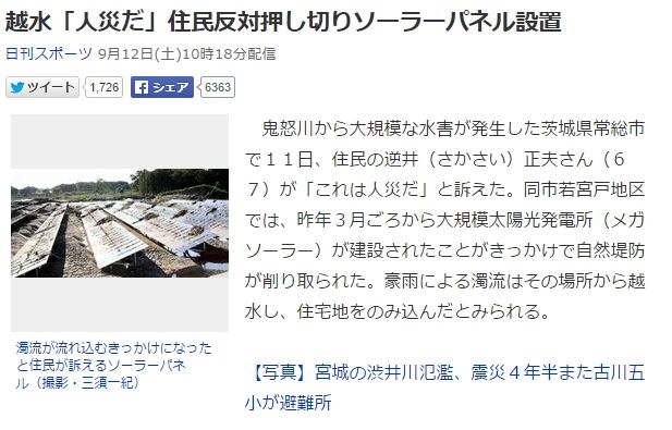 また、日刊スポーツの報道でも、「昨年3月ごろから大規模太陽光発電所が建設されたことがきっかけで自然堤防が削り取られた」と書いてあります。