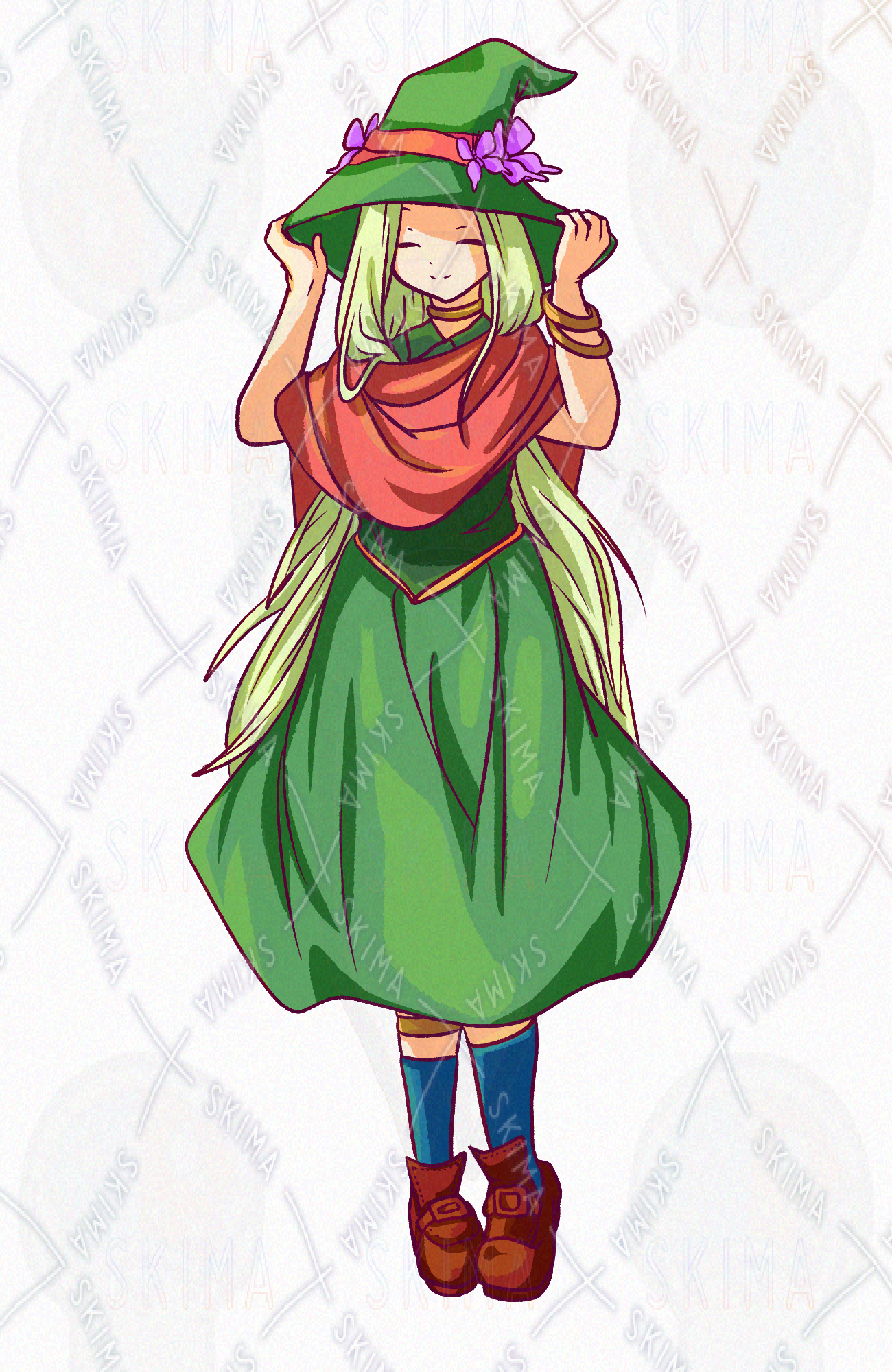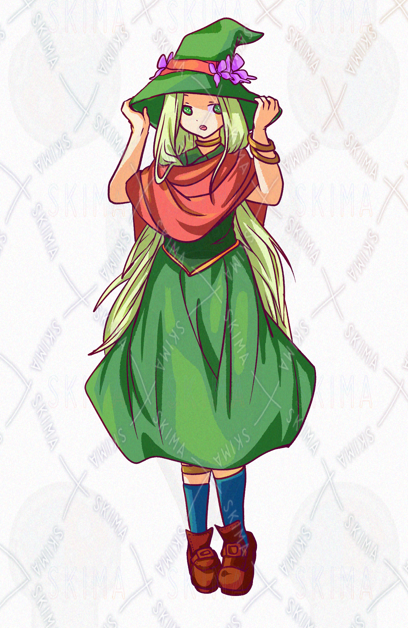 タグ:trpg TRPG 立ち絵 イラスト アイコン 魔女っ子 まじょっこ 魔法使い 女の子 女性 ロングヘアー 長髪 とんがり帽 帽子 蝶 ちょう 緑 ストール かわいい 可愛い 儚い 人見知り スカート ロングスカート ファンタジー
