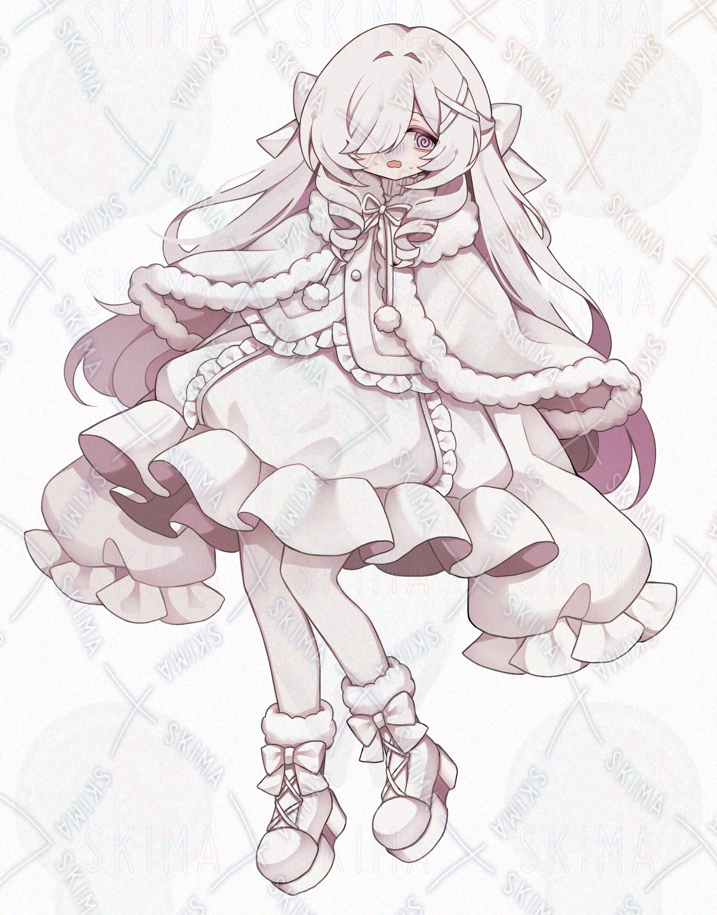 美少女/かわいい/女の子/ロリータ/白髪/綺麗/ロングヘア/血飛沫/ふわふわ/リボン/メカクレ/隠れ目/フリル/ポンチョ