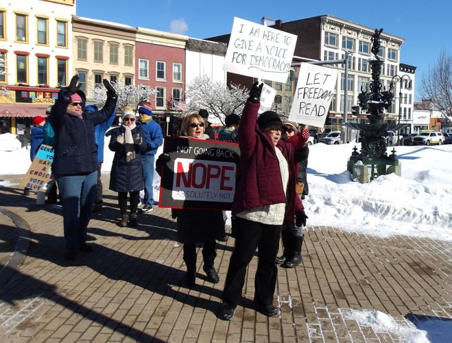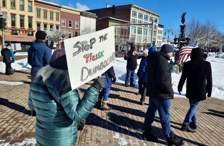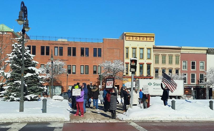 WATERTOWN — Under a brilliant blue sky and gripped by bone-chilling cold, a group of about two dozen people stood their frozen ground for democracy Wednesday afternoon on the Public Square island.