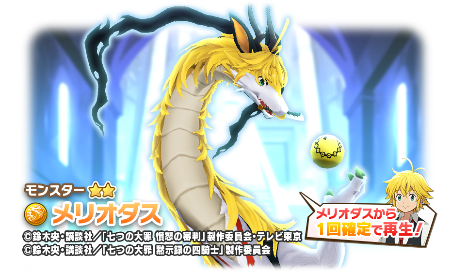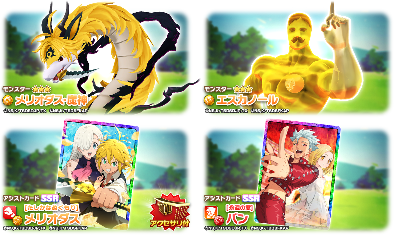 新★3モンスターとしては、シンリュウ種「メリオダス・魔神」、ゲル種「エスカノール」、新SSRアシストカードとしては「【たしかなぬくもり】メリオダス」、「【永遠の愛】バン」が登場します!