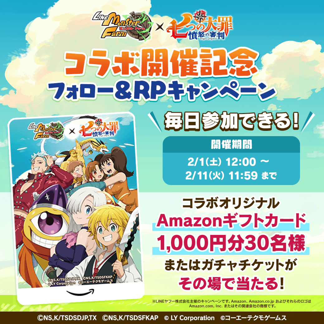 そのほか、コラボオリジナルデザインのAmazon ギフトカードが当たる公式Xキャンペーンなども開催しますので、ぜひメリオダスたちと「LINE:モンスターファーム」の命運を一変させるかもしれない冒険を楽しんでくださいね♪
