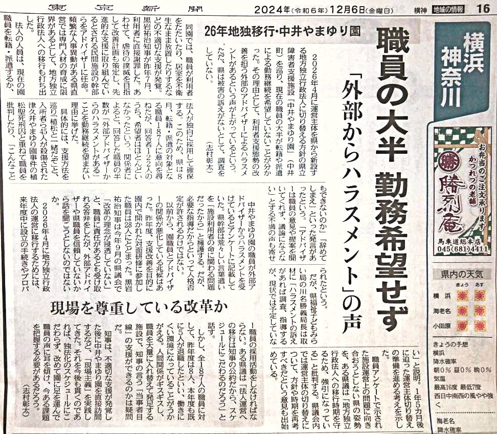 中井やまゆり園のアドバイザーとして県職員を指導しているのは、同愛会の管理職です。同愛会は多数の利用者虐待事件が発覚した中井やまゆり園の職員を支援を学ばせるため同愛会の施設に「留学」させて、その様子がNHKニュースおはよう日本で放映されました。記事によれば、「植松と一緒だぞ」「こんなこともできないのか」「辞めてしまえ」と、尊大な姿勢で県職員を指導しているとのことです。中井やまゆり園の職員が公務員の身分を捨てて退職が相次いでいることは異常なことです。