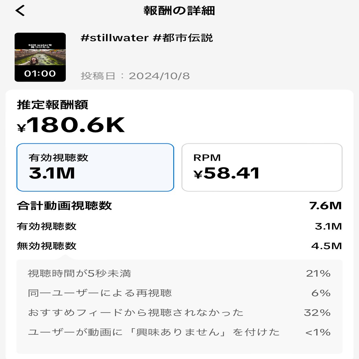 ダンス動画などは当然1分未満なので収益対象ではない