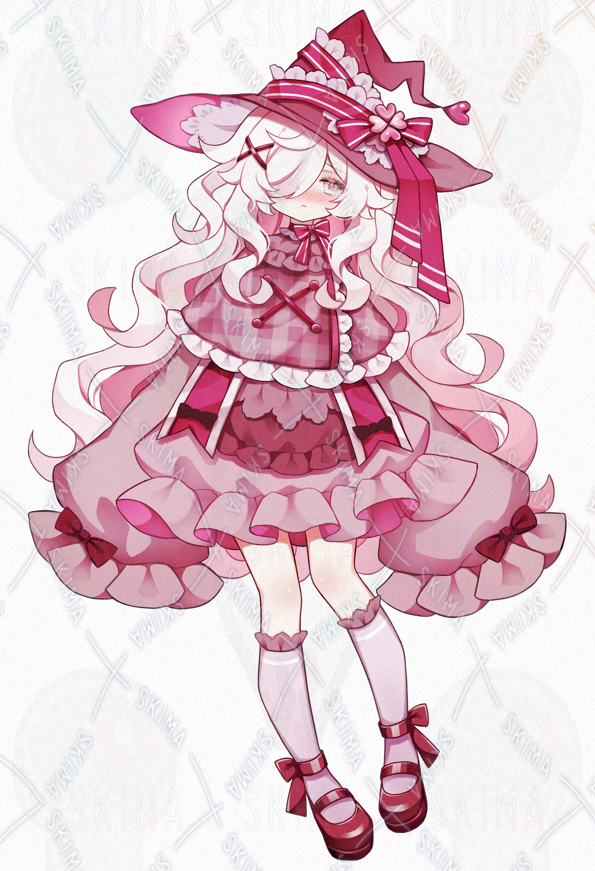 美少女/かわいい/女の子/綺麗/ロングヘア/白髪/リボン/メカクレ/隠れ目/ハート/ファンタジー/ロリータ風/魔女
