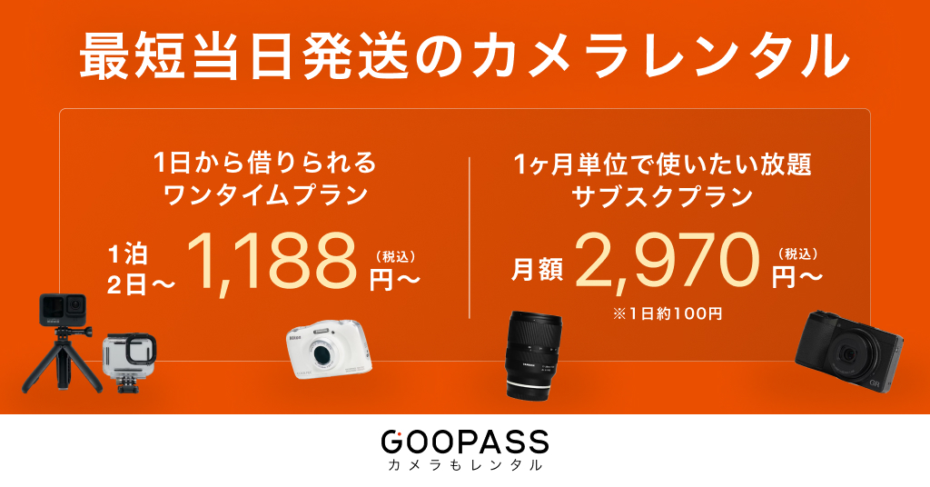 “カメラやApple製品のレンタル・中古買取・中古販売“GOOPASS(グーパス)では、1泊2日からの短期でもレンタルすることが可能(ワンタイムプラン)ですが、長期で借りる際には月額のサブスクプランがお得。