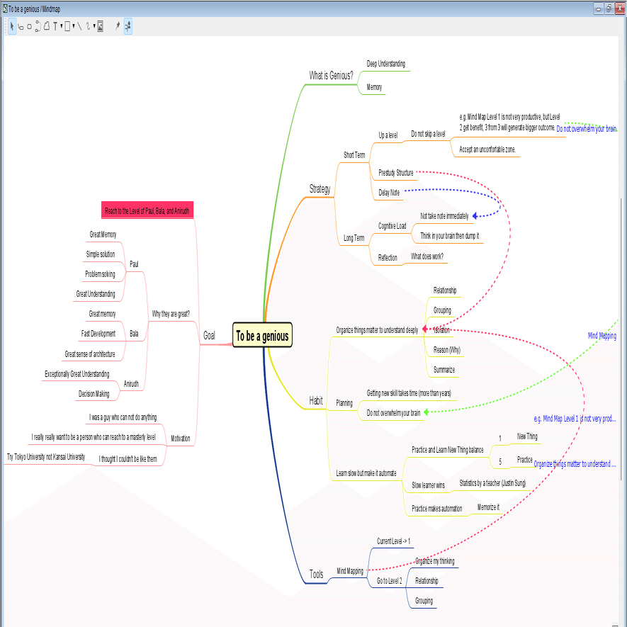 自分も昔からマインドマップを書いていたが、一つ変えたところが、マインドマップを書いた後、整理をするようになったことだ。昔は、内容が書かれていればいいという程度だったが、理解を深めるために、関連を考えたり、グルーピングをするために、何回もリファクタリングしたり。昔はそういう「きれいにする行動」は無駄と思っていたが、むしろ逆だったようなので、そうするようにしている。人は簡単に物事を理解できない。だから、こねくり回して、整理して、いろんな視点からみて、思いついた疑問を調べて、そういうことをちょっとづつして、理解を深めることが出来る癖が出来る感じがしている。