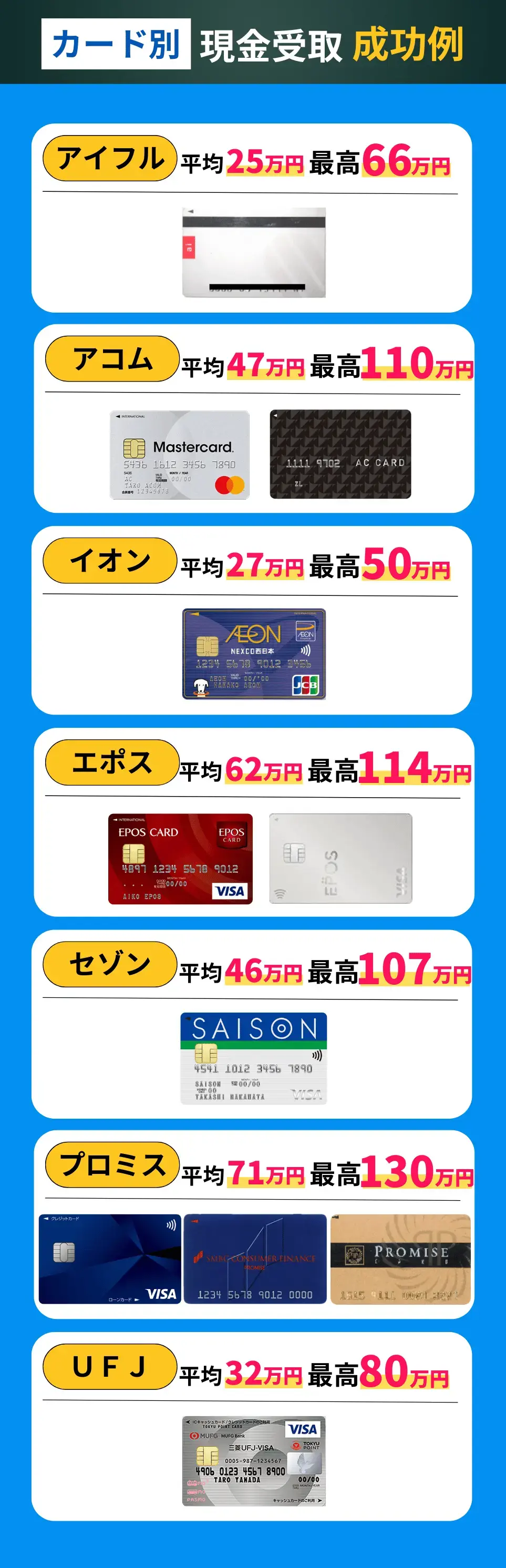※お客様のご依頼に基づき、司法書士法人いよリーガル2021年4月~2024年5月の間に調査した結果、過払い金の発生した案件における、過払い金返還請求により取り戻したカード別の過払い金平均額と過払い最大金額。