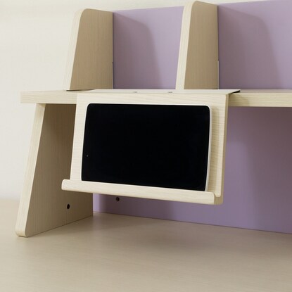 デスク天板は硬質塗装を採用、タブレット学習用パット置き付きでデスクスペースを広々と使えます。タップ収納付きなのでごちゃごちゃする配線もすっきり収納。しかも付け替え可能なデスク脚です。