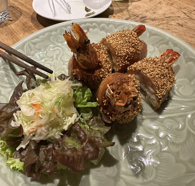 海老トーストは大きなプリッとした海老にぎゅっとパンが巻き付いたスタイル。良い感じに揚がっていました。