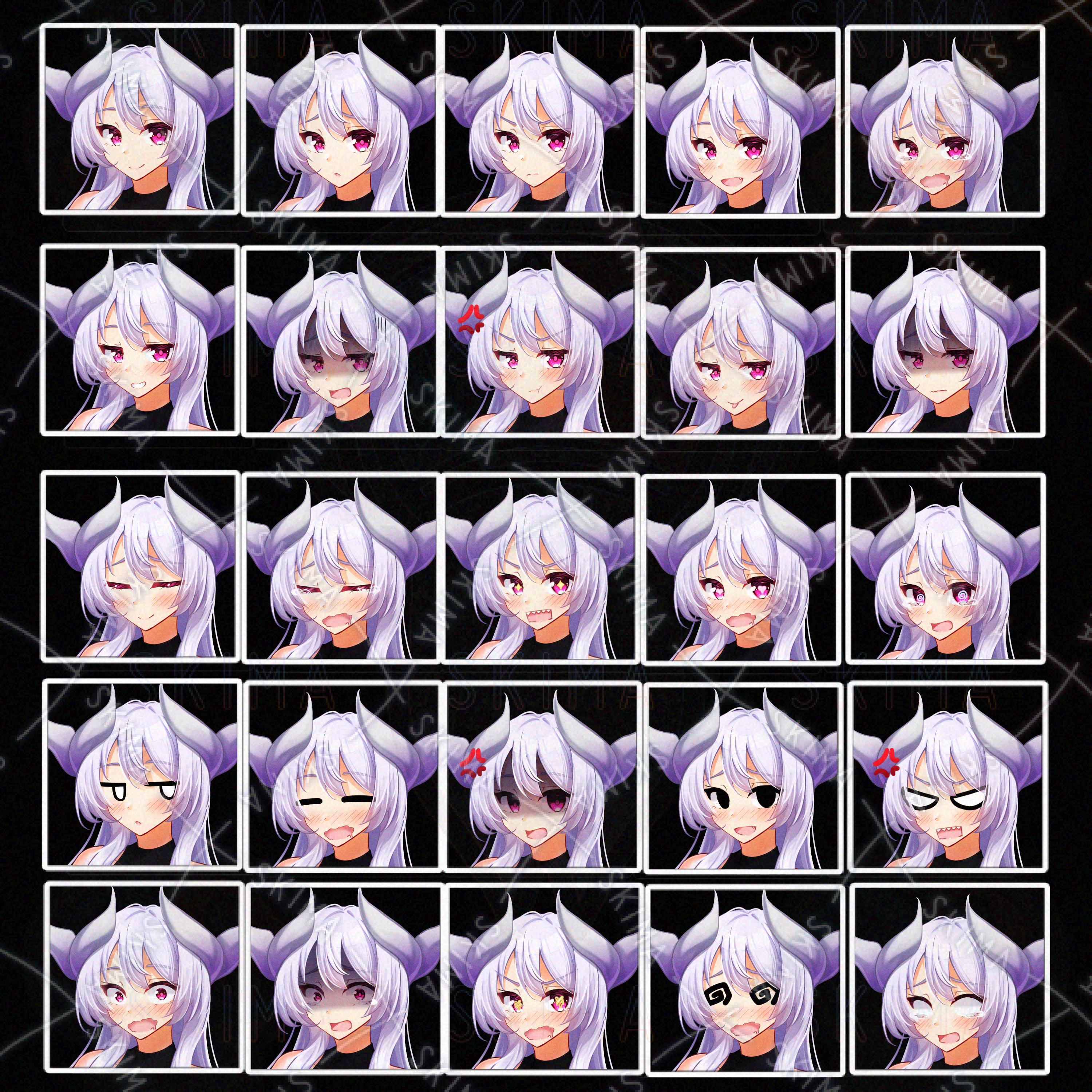 眼 16種(通常・ジト目・瞑り・キラキラ・ハート・混乱・ギャグ・ギャグ瞑り・通常光なし・病み・驚き・驚き光なし・ギャグ怒り・金眼(円マーク)・ギャグ混乱・白目)