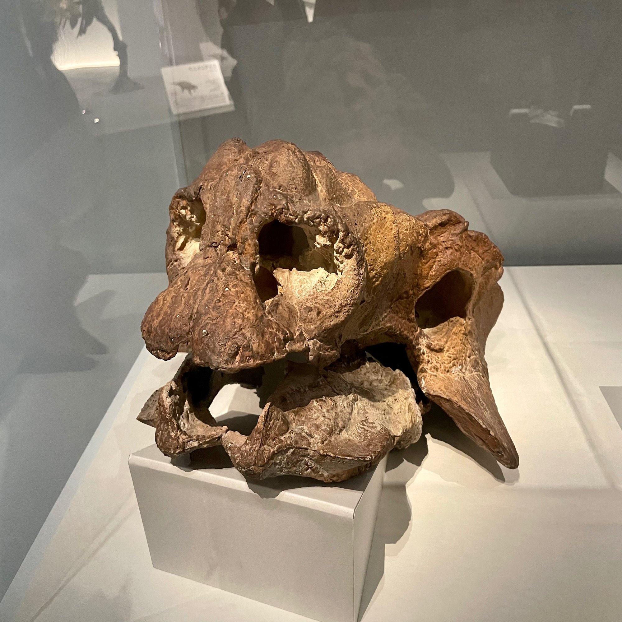恐竜とは別に……というかこれも恐竜なのですが、個人的にちょっと気になったのが、「サイカニア」という種の頭骨でした。撮ってきた写真を見ると「なんでこれを撮ってきた?」という感じなのですが、思い出しました……なんか現地で見た時には「土偶でこんな形なかったっけ?」って思ったんですよね。縄文人って、わけの分からない形の土偶を作っていますが、もしかすると半魚人ならぬ半恐竜人のようなものを形作っていたのかもなと……。