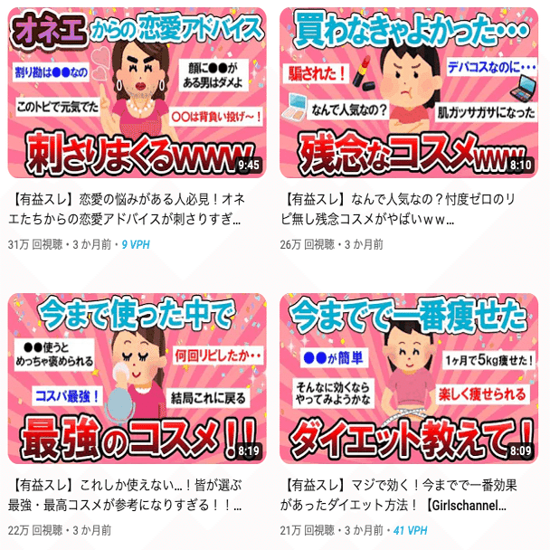 2chまとめの動画を沢山みて、良い要素、悪い要素を拾ってきます。