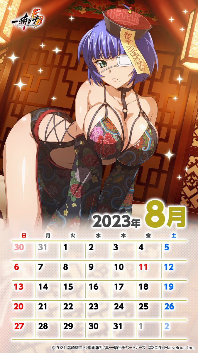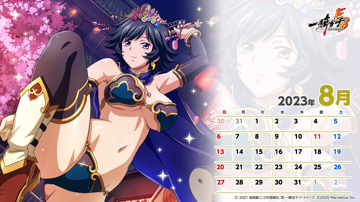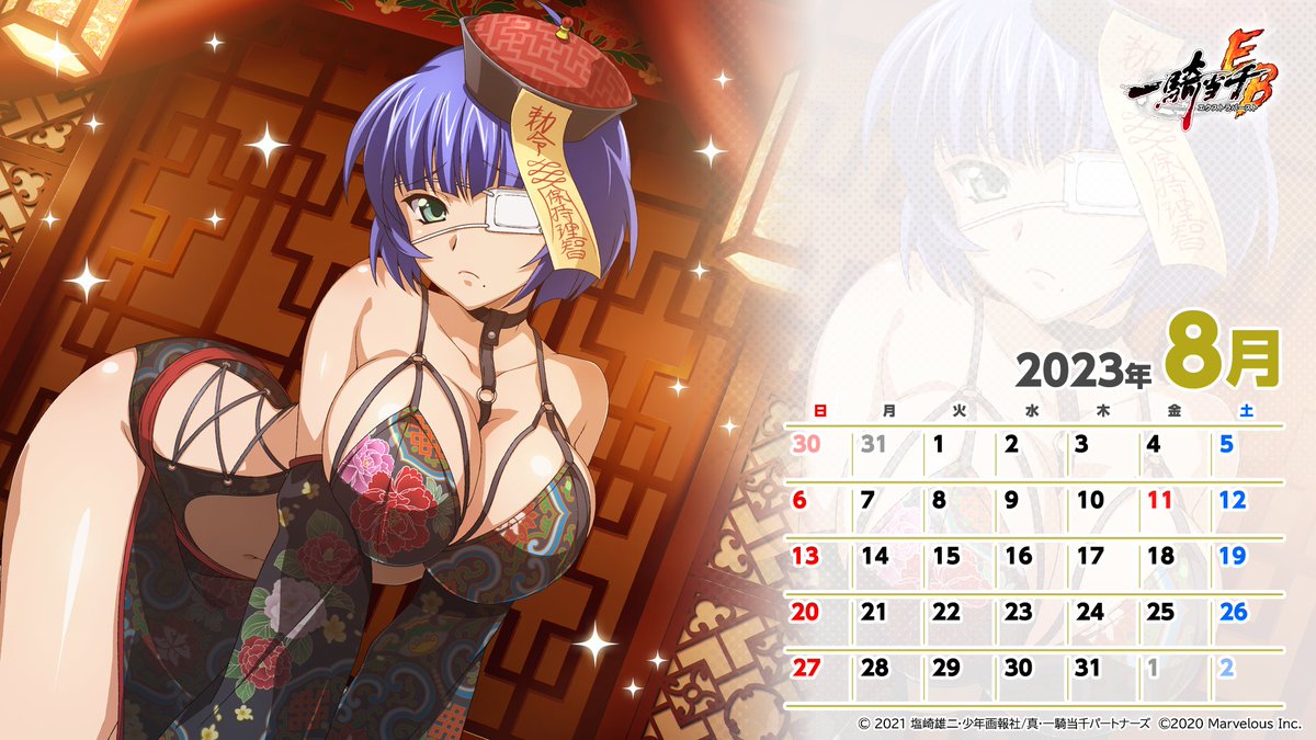 📅カレンダープレゼント📅 イベント「婀娜やか ラブリーキョンシー」の開催を記念して 限定闘士「【【妖姿媚態】呂蒙子明」 「【陰陽道士】楽進文謙」の 2023年8月度のカレンダーをプレゼント🎁 #えくばと #一騎当千EB pic.x.com/KiZipyFrHY
