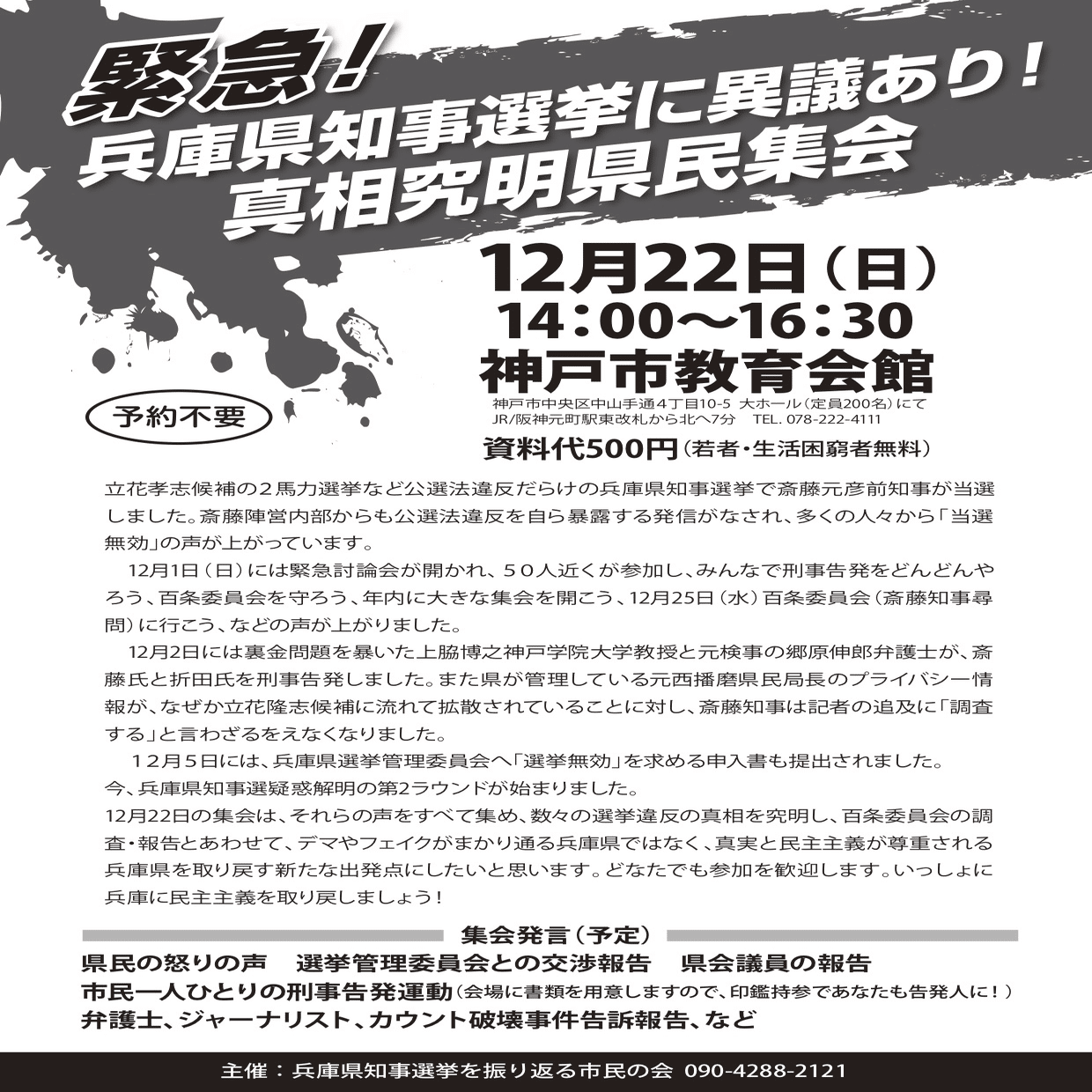 【神戸市】😀次の日曜日(12月22日)は13時に「尊師」が兵庫県警に出頭。14時には「知事選挙に意義あり。真相究明県民集会」です。印鑑持参で告発人になれます。