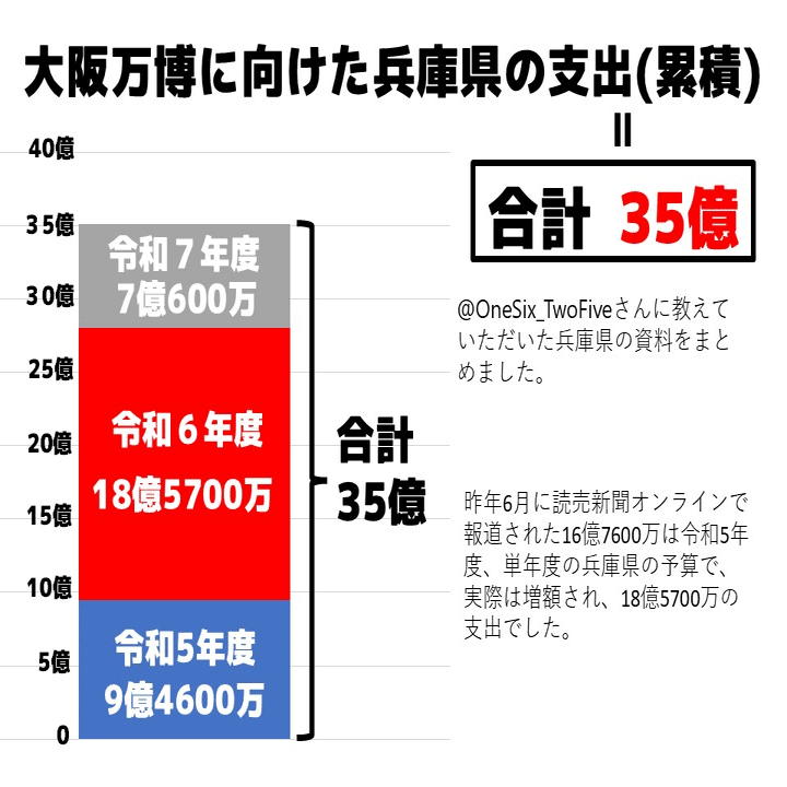 兵庫県の万博への支出は、16億7600万だけで済んでなくて、、、累計35億でした😵