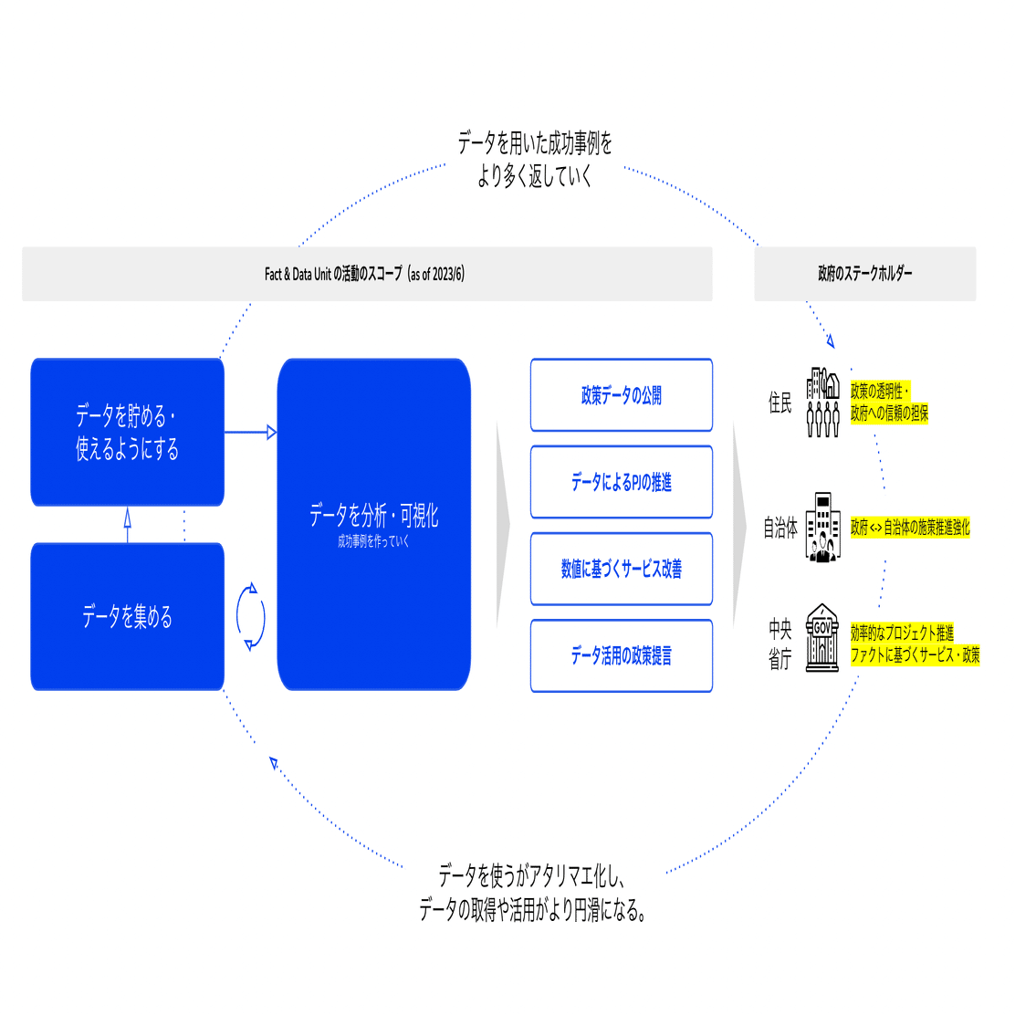 ファクト&データユニットは、そのような状況を打破するために、政府内で多くのデータ活用事例を創出し、「政府において、データを使うをアタリマエにする」というミッションのもと活動に取り組んでいきたいと考えています。