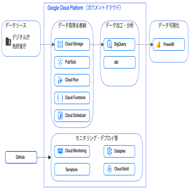 一部は政策データダッシュボードのように国民向けに一般公開しているデータもあります。 活用しているサービスを含む技術スタックを列挙すると以下のようになります。