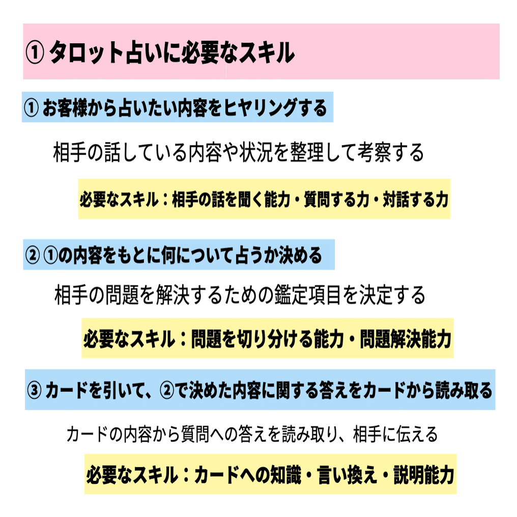 です。そうすると、実はタロット占いに固有なスキルは「カードへの知識」だけで、他のスキルはタロット占いでも身につくスキルだということがわかります。