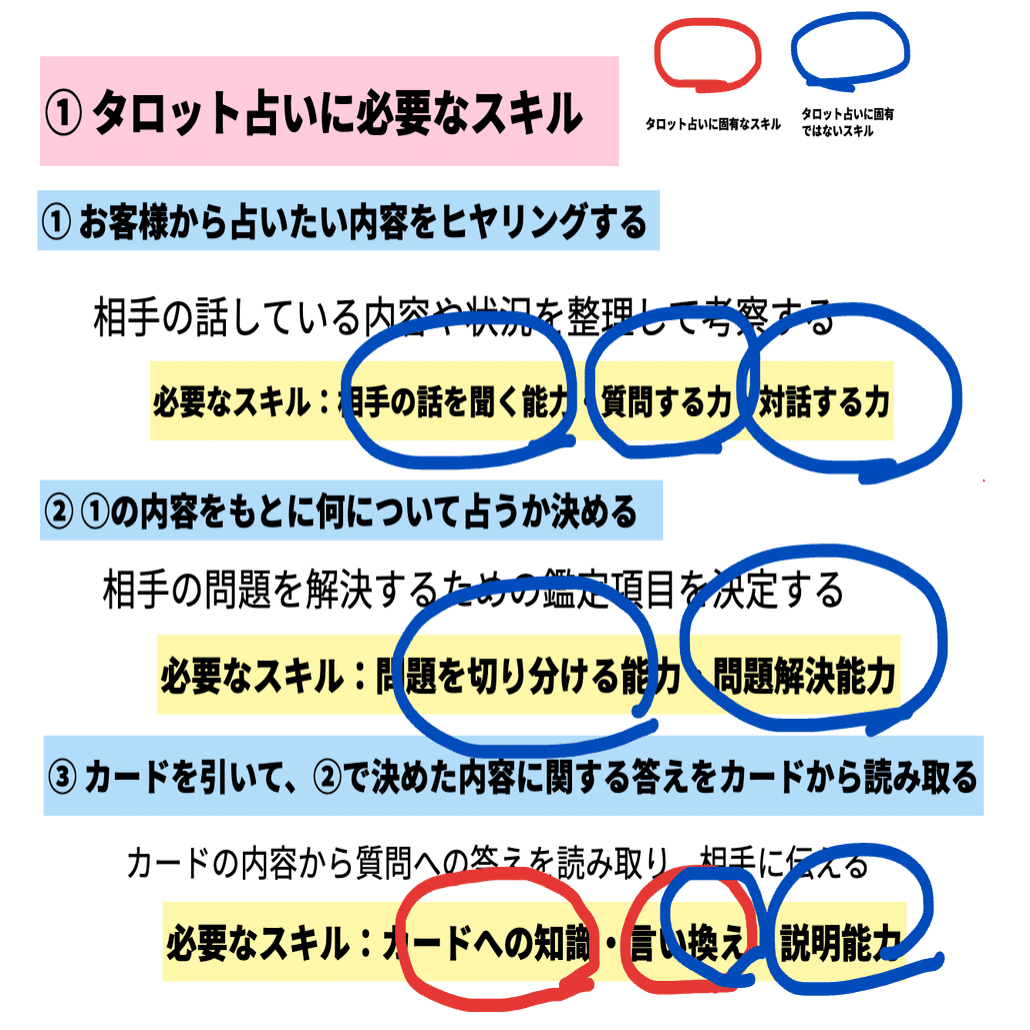 「タロット占いだけに固有なスキル」と「タロット占いだけに固有ではないスキル」に分類してみます。
