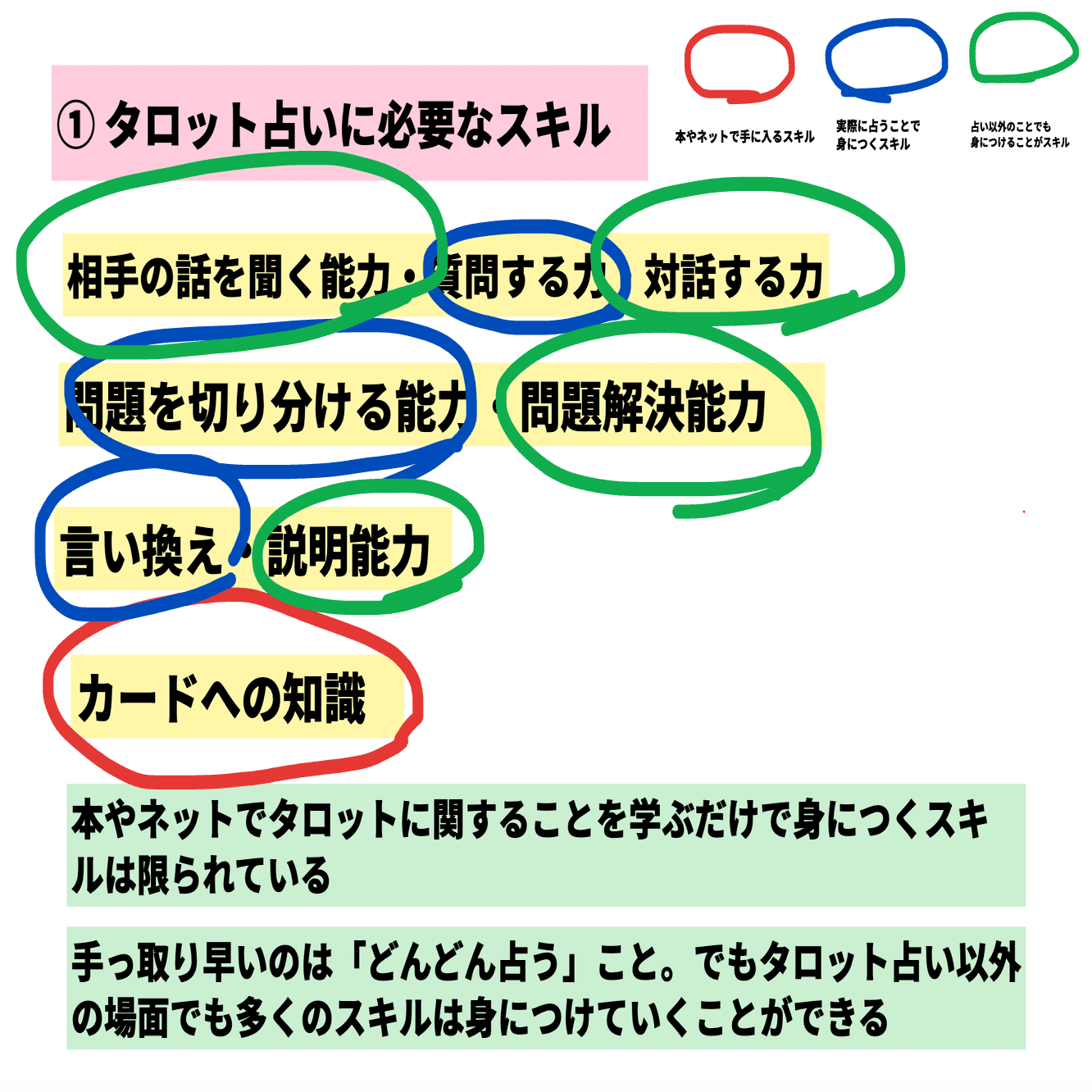 ・緑の丸:「タロット占い」をやることでも身につくが、「タロット占い」以外のこと(仕事や日常生活での他の人との関わり)でも身につくスキル