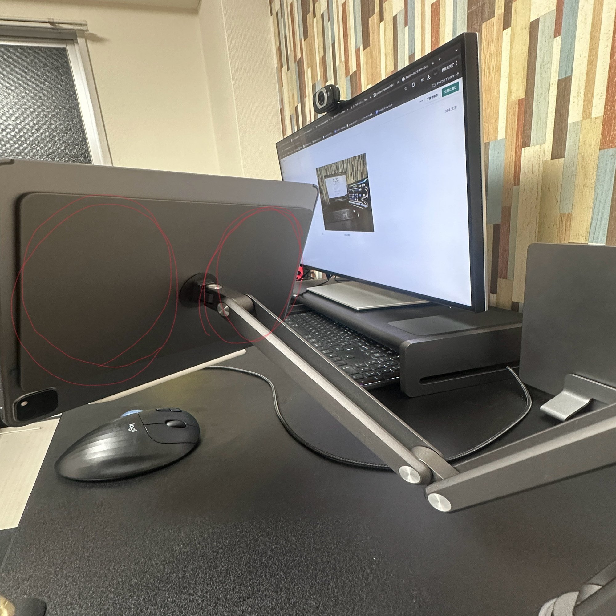 僕がiPad Proをアーム運用しているのでアームの裏面に固定(第一希望)