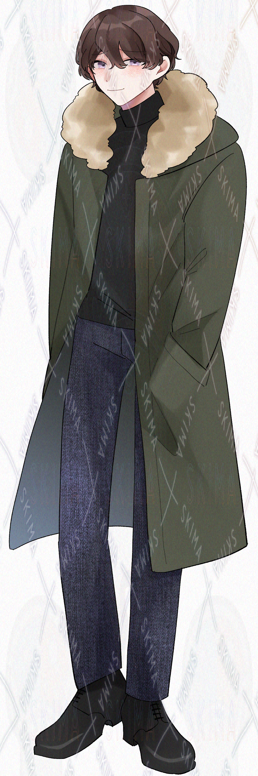 アウターを着た茶髪癖毛の男性の立ち絵です。