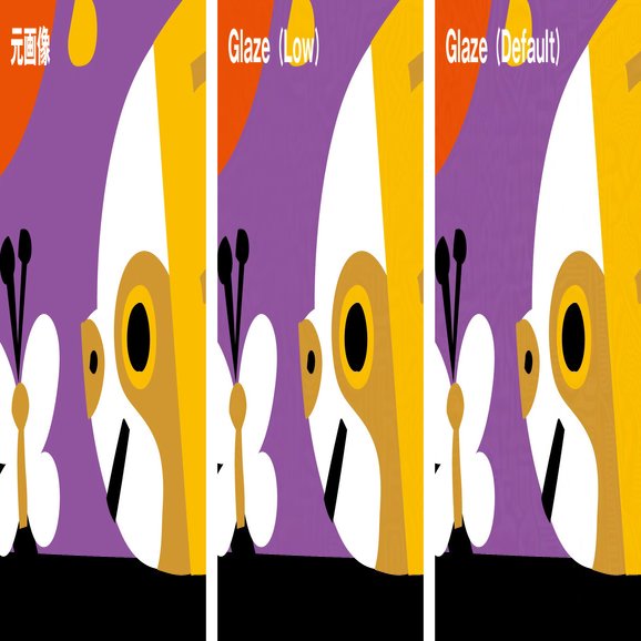 簡単に言うと、Glazeを使うことで機械学習を邪魔することができます。しかしその代償として少し画像が粗く見える、画像を保護するのに少し時間がかかる(15〜20分程度)ということがあります。