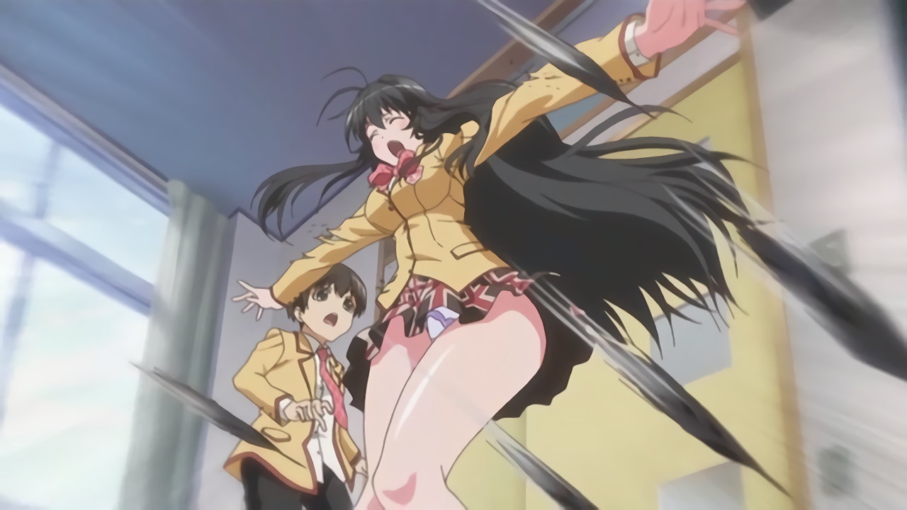 突風でスカートが捲れ、パンチラする女子生徒たち。