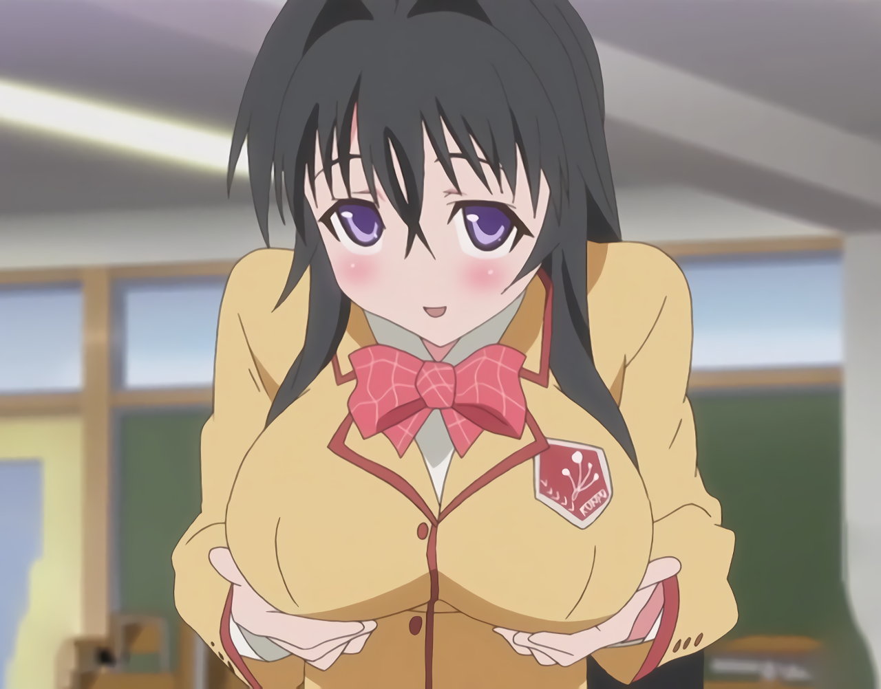 ブレザーのボタンを外し、巨乳を見せつけるちずる。