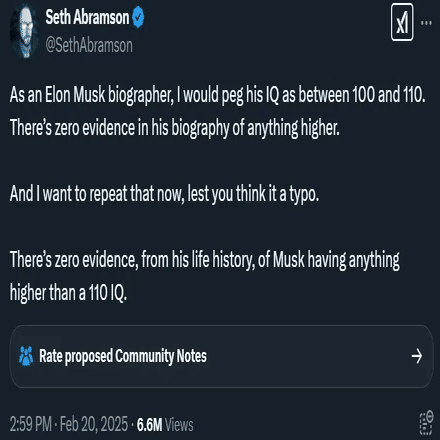 イーロン・マスクの伝記作家として言うと,彼の IQ は 100から 110 の間だと見ている.もっと IQ が高いという証拠は,彼の半生にはまったく見つからない.