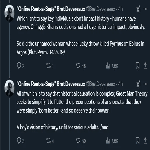 ああ,偉人理論だね.多少なりとも有能な歴史家の大半が,大学院の一年目でこの推論モデルを放棄するのには理由があるんだよ.