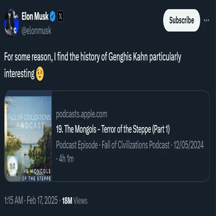 「カーン」の英単語 “Khan” の綴りを間違えたと言って小馬鹿にする前に,他でもなくジンギス・カーン当人も読み書きを習ってなくて自分の名前を綴れなかったことは思い出しておいていい――これもまた,本を読んで学ぶことと組織作りの才覚はまるで別物だってことを鮮烈に思い出させてくれる.「イーロンは世界最高の IQ の持ち主じゃないから,この国をけっして征服できない」なんて自分を安心させている進歩派たちの愚かさは,「文字も読めない馬乗りなんかに我が国が征服されるわけがない」と自分に言い聞かせていた13世紀の学者に劣らない.
