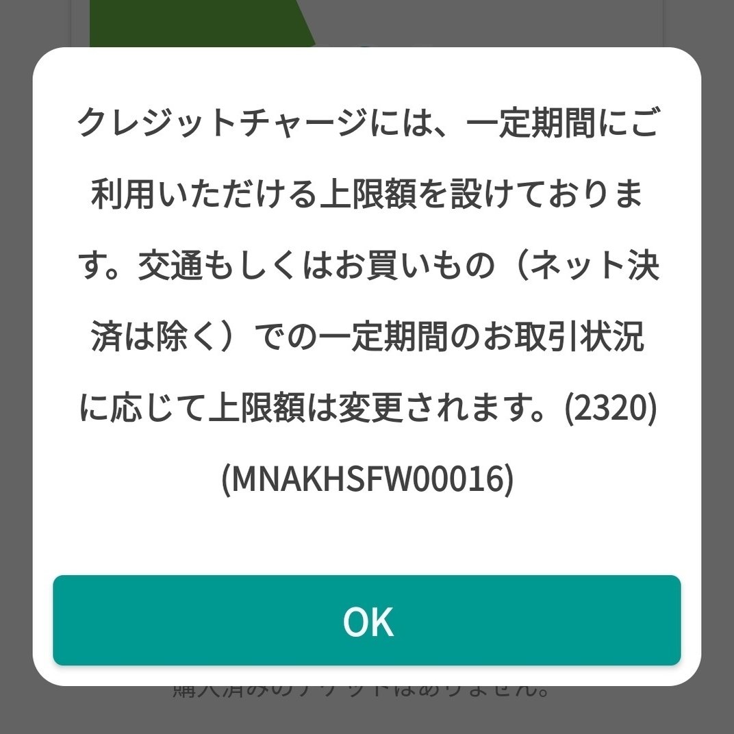 クレジットチャージには、一定期間にご利用いただける上限額を設けております。交通もしくはお買いもの(ネット決済は除く)での一定期間のお取引状況に応じて上限額は変更されます。(2320)