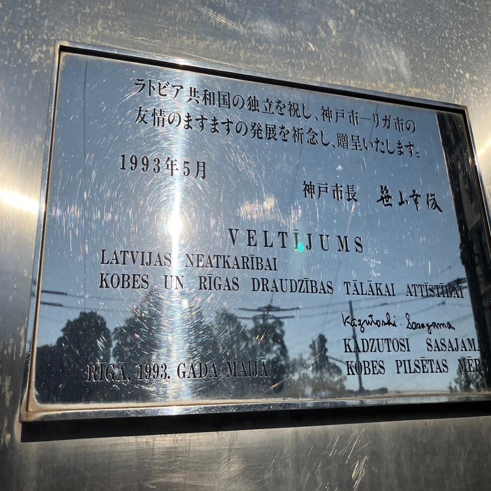 ラトビア共和国の独立を祝し、神戸市-リガ市の友情のますますの発展を祈念し、贈呈いたします__と書かれた銘板に深い歴史を感じざるを得ません。