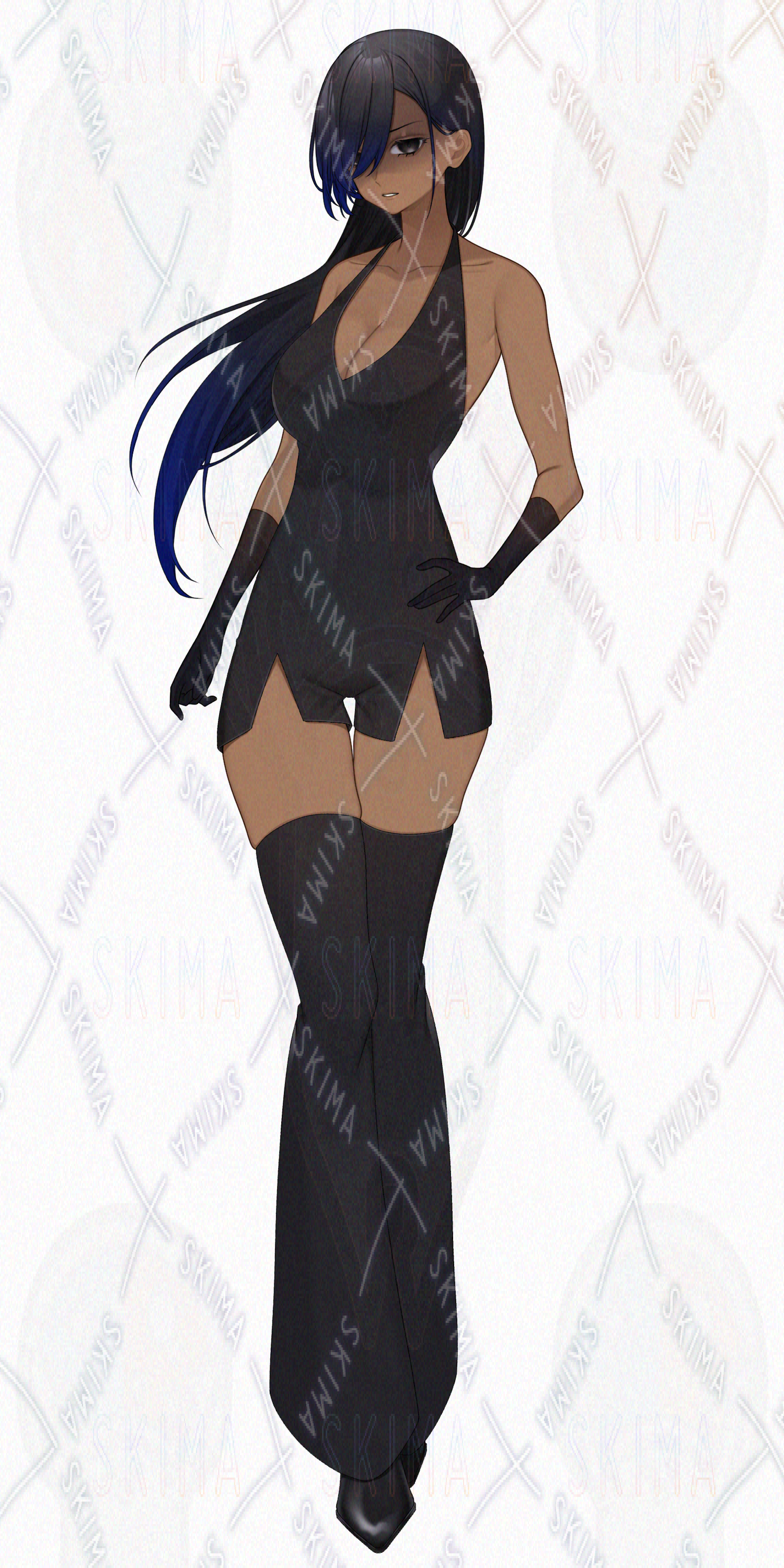 女性/黒×青髪/黒眼/褐色肌