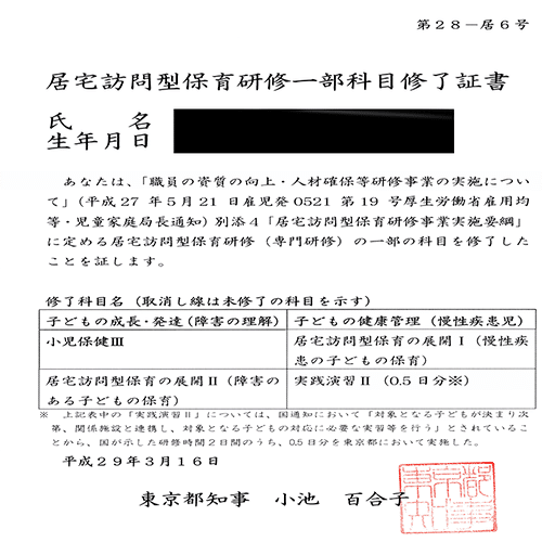 医療的ケア児に対応できるように、専門研修を受けて、都知事が発行する研修修了証を交付されることが従事者の要件になっています。