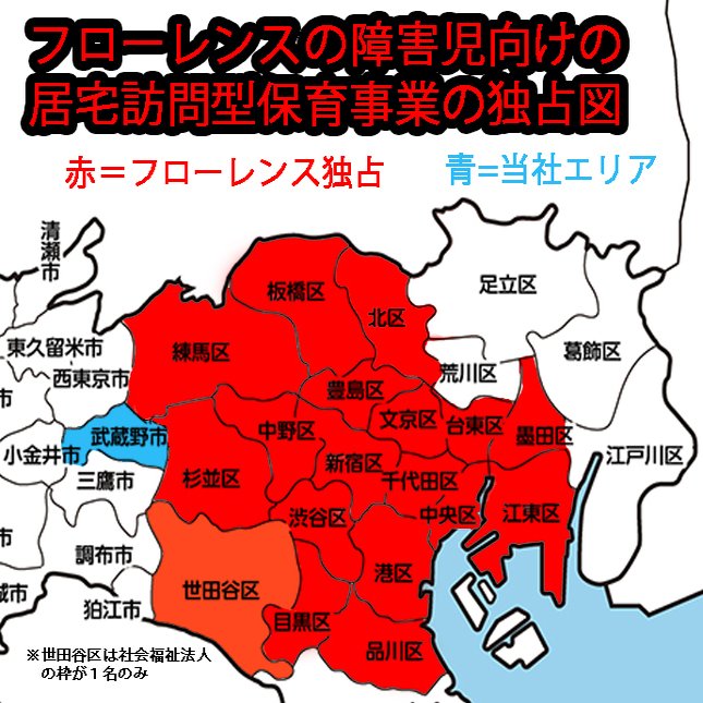 この図は、居宅訪問型保育型保育事業※の障害児向けの認可状況を示したものです。居宅訪問型保育事業には、待機児童向けのものと、障害や疾患等で集団保育に馴染まない障害児向けの二種類があるのですが、東京都内の実施自治体は、当社が認可を受けている武蔵野市を除いて、ほぼ全てフローレンスが独占しています。(例外として、世田谷区でフローレンスの他に社会福祉法人に1名だけ枠があります。)
