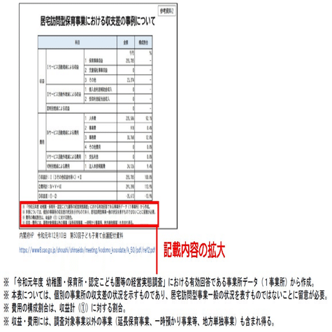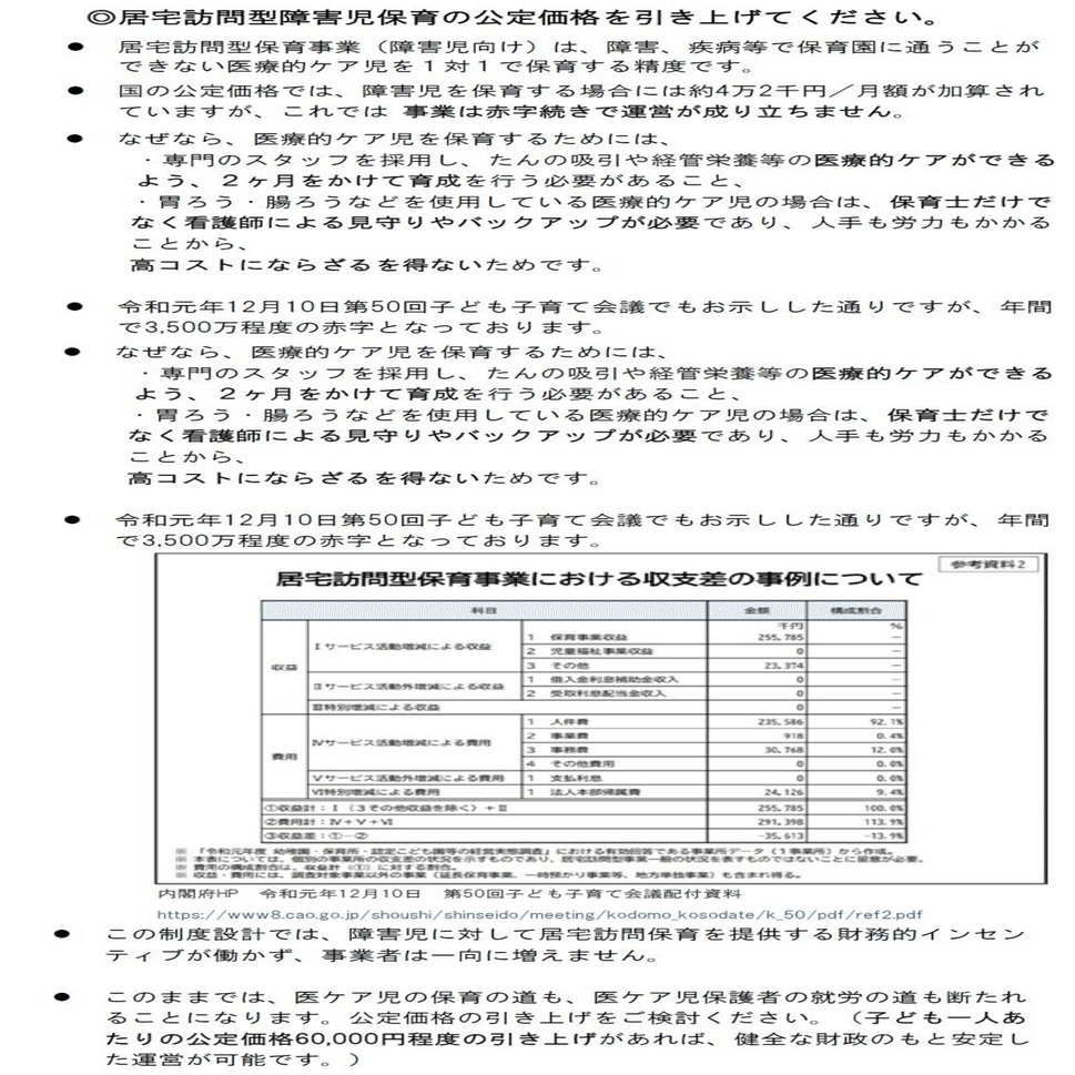 と題して、公の場に複数回提出し、居宅訪問型保育事業が赤字であるため、公費を増額するべきであると、政府に要求しました。