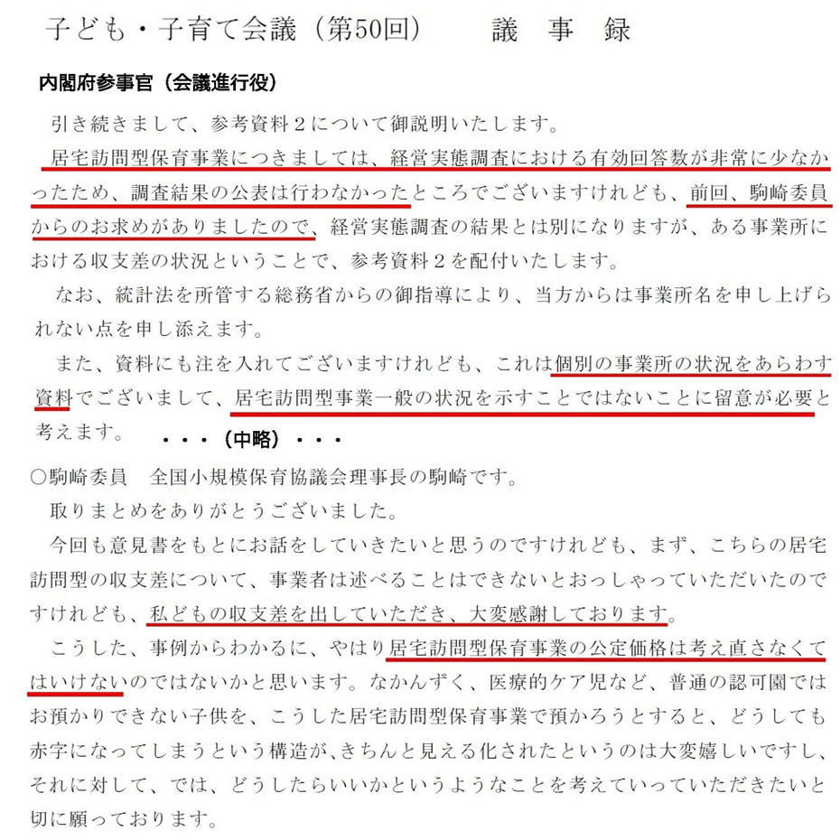 この内閣府に提出された資料は、駒崎氏が代表を務めていたNPO法人全国小規模保育協会のホームページにも、政府への提言の実績として掲載されていますが「出典:内閣府HP 令和元年12月10日 第50回子ども子育て会議配付資料」と記載されています。その画像も非常に小さくて、注釈が読み難いです。さらに、この資料が提出された経緯は、議事録もすでに公開されなくなったので、殆どの人は分かりません。