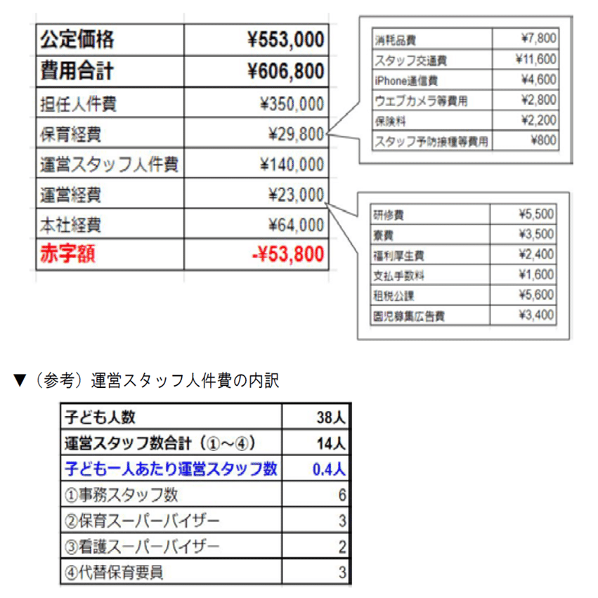 さらに、収益の内訳は公定価格しか記載がありません。公定価格とは、保育事業者が国から受け取る保育料(利用者負担額含)の額のことですが、この他に、東京都の場合は自治体から宿舎借上げ事業補助金(月8万2000円/居宅1件※事業者負担1/8)や、キャリアアップ助成金(年間約80万円/居宅1件)の収益があります。それらが参入されておらず、更に訪問看護の事業収益を記載せずに、看護師の人件費を計上すれば、当然に大きな赤字となります。