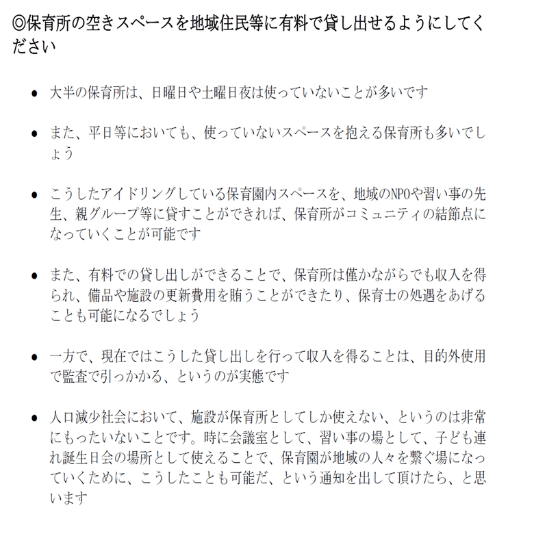 駒崎氏は、内閣府子ども・子育て会議(第50回)で、公金で運営されている保育園の施設を、有料で貸し出せるように提言しただけのことはあって、別事業への経費共有と効率化には非常に熱心であるように見受けられます。
