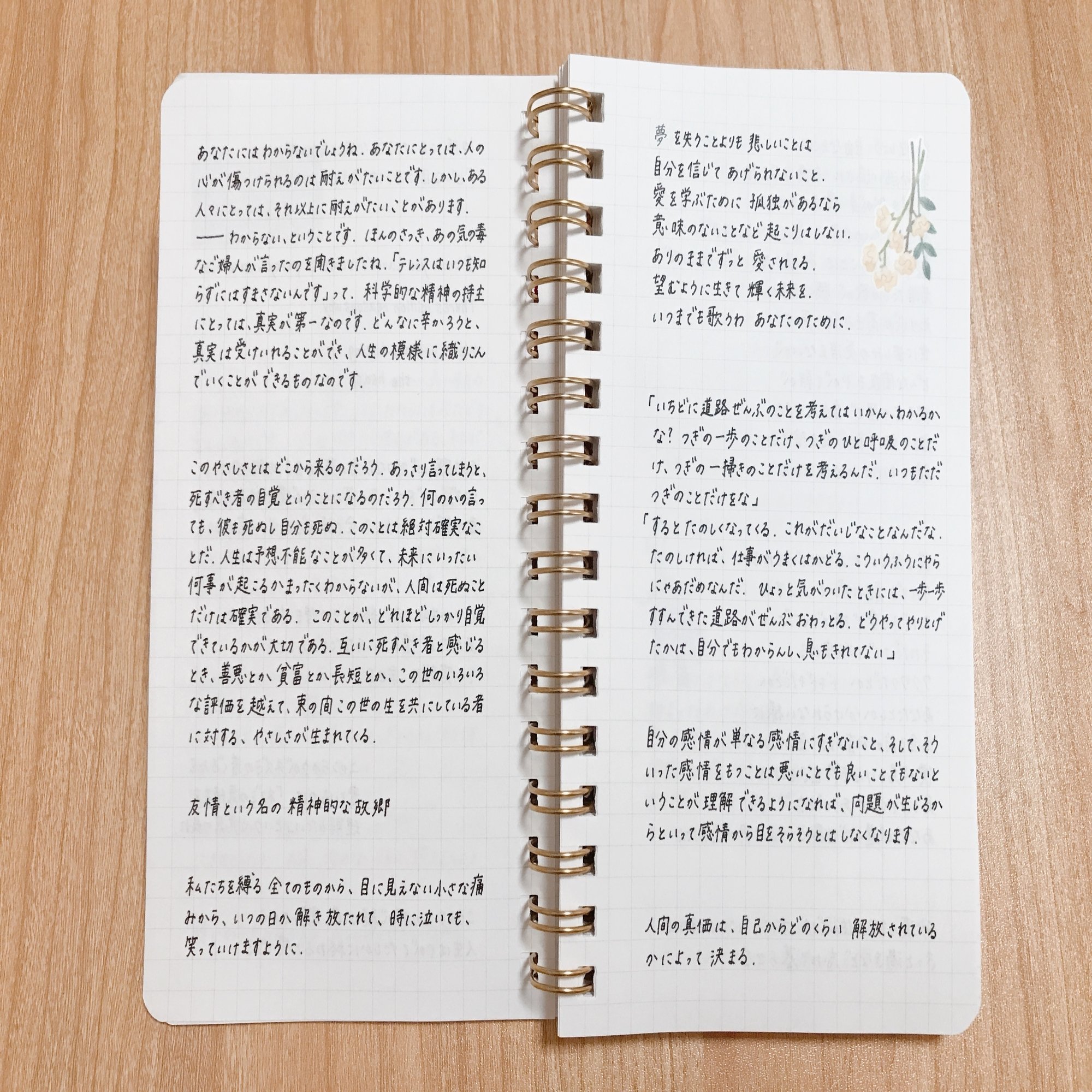 言葉ノートには、好きな言葉を書いています。本や映画で心に響いた言葉や、好きな歌詞など。他のノートにもメモしていますが、このミモザのノートは、より永久保存版というか、おばあちゃんになっても大切にしたいくらい、私にとって選りすぐりの言葉を集めています。