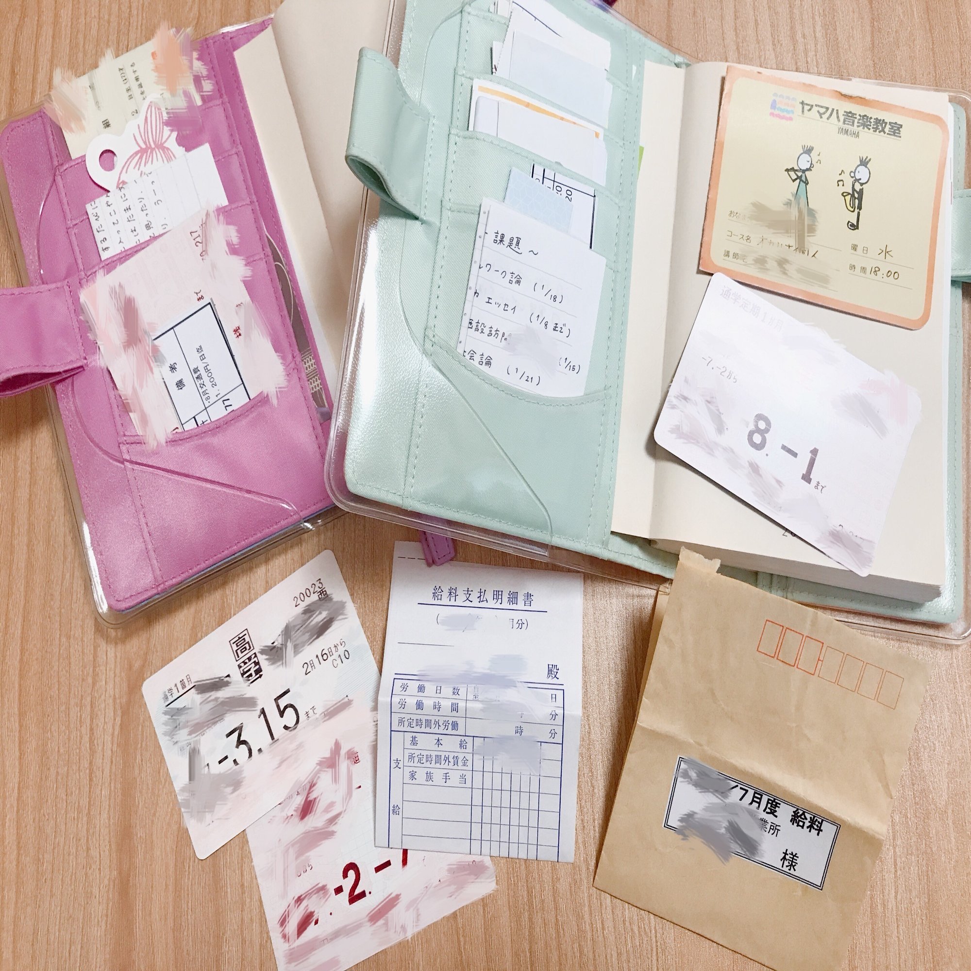 高校の定期券、学生証、初めてのアルバイトでもらったお給料袋、オカリナを習っていたときのヤマハカード、奮発したお買い物のタグ、ショップカードやチケット類、特別な食事のおしながき、期限の切れた愛犬のどうぶつ健康保険証、旅先のレシートや切符、予算立てや課題のリスト、高校生のとき親友とよく行ったカラオケのレシート、渡せなかった手紙…… どれも懐かしいです。