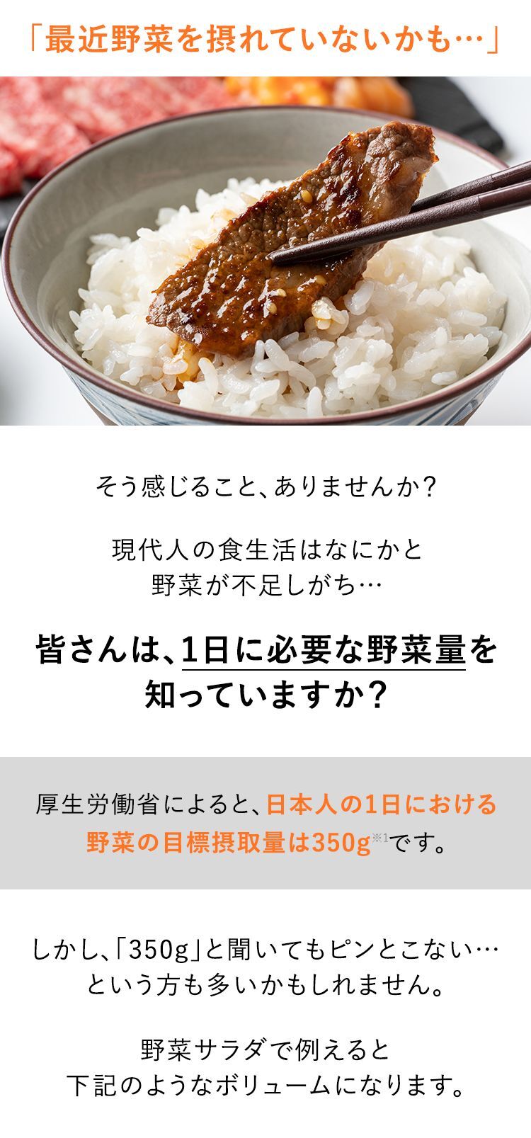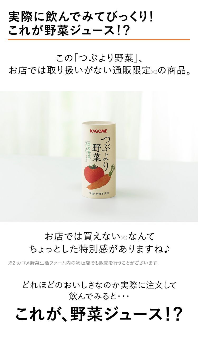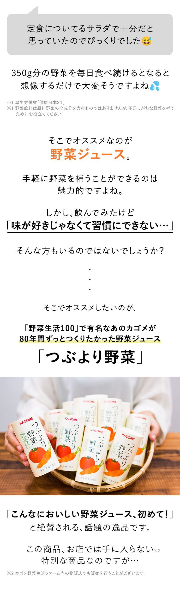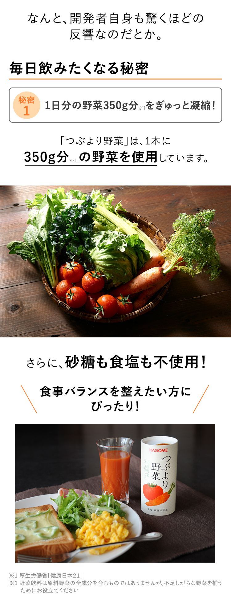 (※1) 厚生労働省「健康日本21」野菜飲料は原料野菜の全成分を含むものではありませんが、不足しがちな野菜を補うためにお役立てください