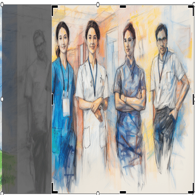 スライド3枚目の『先生たち、ありがとう』という絵。一番左に描かれていた血塗れの医師?がトリミングされている。