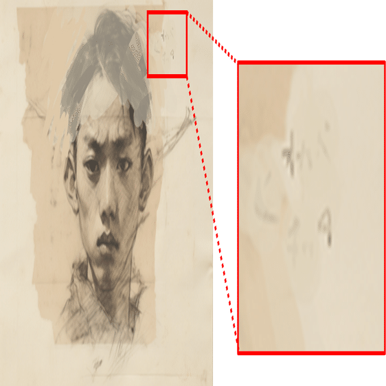 Youtube動画でも触れられていたもの。題名『己』という作品。右上にかなり薄くて読み取りにくいが「オカベキッタ」と書いてある。「オ」と「タ」が比較的読みやすい。