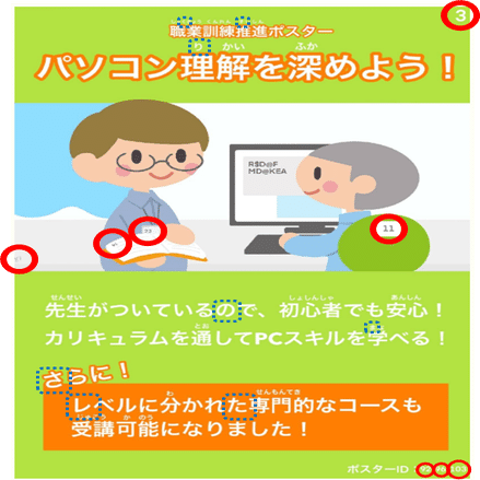 ポスター内には数字が散らばっている。これらはポスター内の文字(漢字の箇所はふりがな)を上から順に数えた時に何番目の文字を読むべきかを表している。